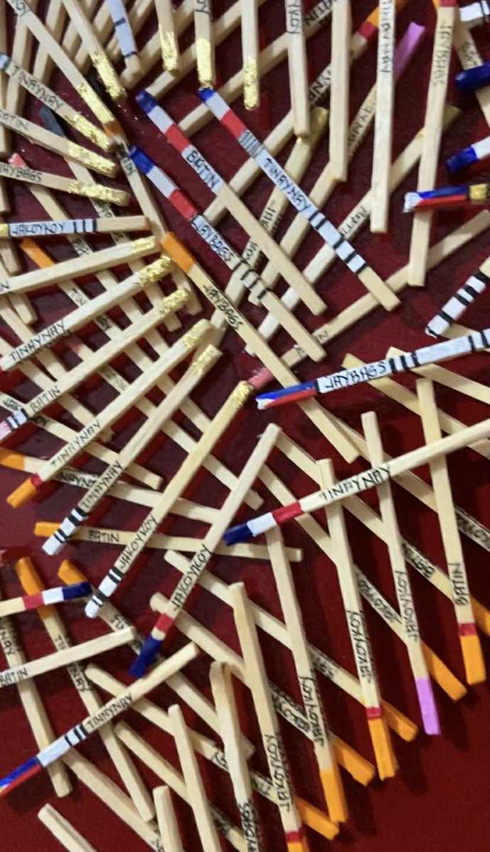 These artworks are my response to the current events both social and political issues by channeling down my voice as an artist into a childhood object i used to play. Matchstick or ‘Posporo’ in our local term, is an instrument to start a fire under controlled circumstances. The fire herein is symbolic and may represent a burning desire, a light to illuminate darkness and a spark to keep the fire burning.